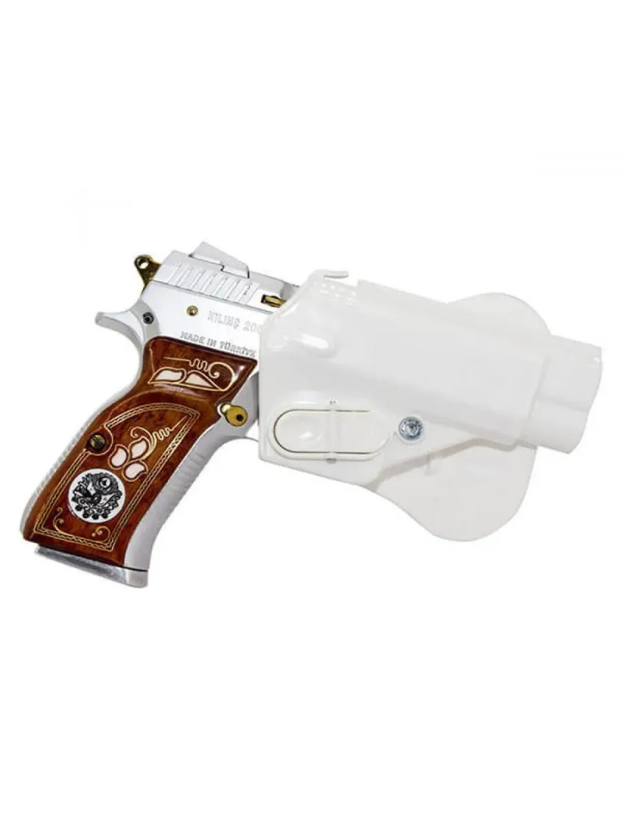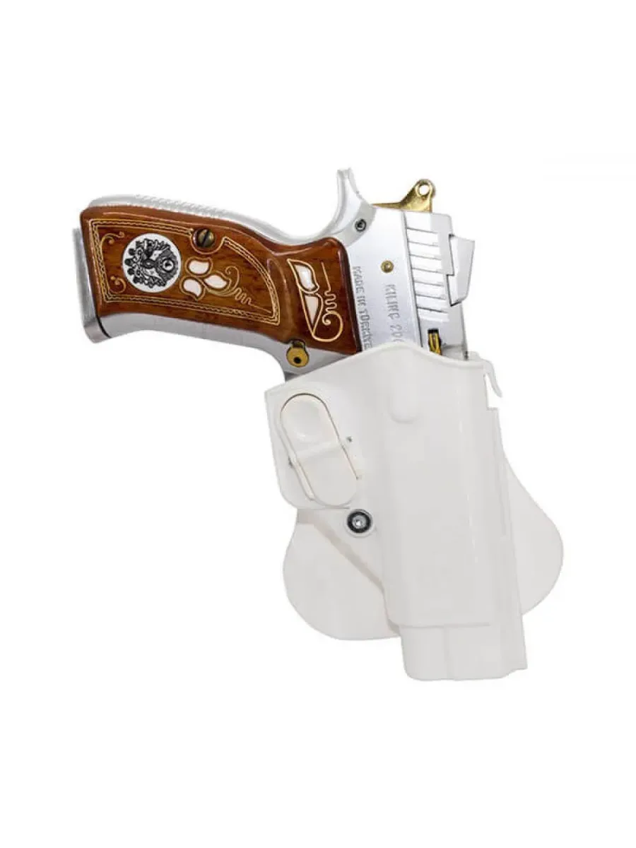 Beyaz Toma Holster, kırılmaz polimer gövdeli, ergonomik ve 360° dönebilen tasarımı ile Sarsılmaz, CZ ve Canik tabancalar için mükemmel uyum sağlar.