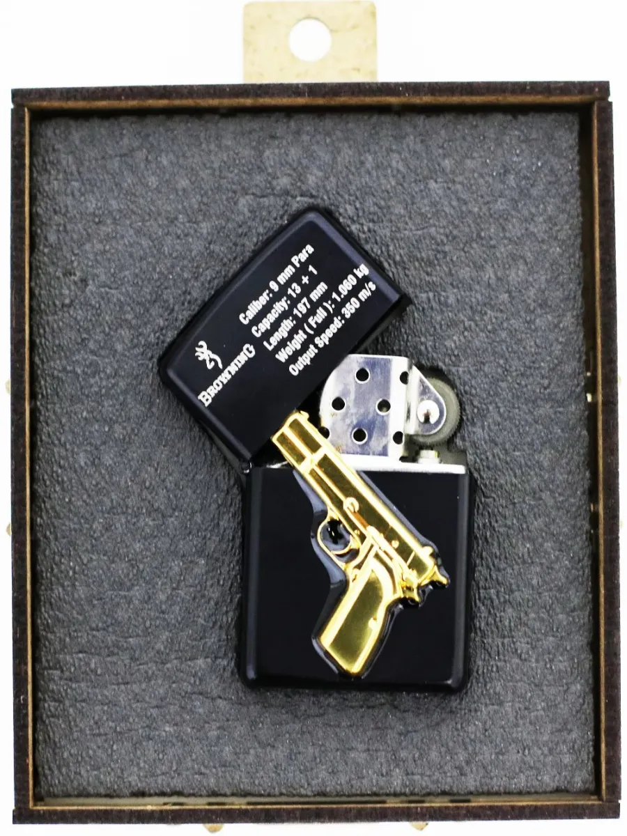 Browning desenli, benzili sarı çakmak. Şık ahşap kutusunda, kompakt boyutlarıyla kolay taşınır. Benzin hariç, kaliteli ve dayanıklı tasarım.