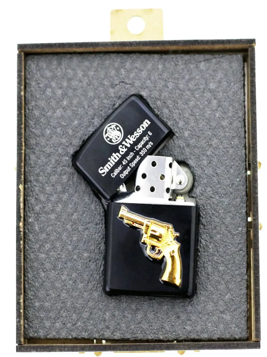 Revolver desenli şık ve kullanışlı benzilli çakmak, ahşap kutusuyla birlikte sunulur. Dayanıklı yapısı ve kompakt ölçüleriyle ideal bir aksesuar.