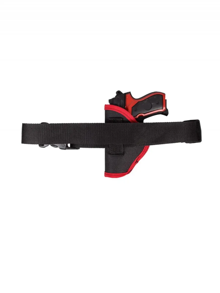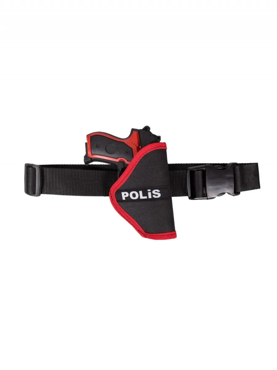 Çocuklar için siyah kırmızı Yunus Polis kostümü seti; palaska, kemer ve oyuncak silahtan oluşan eğlenceli ve kaliteli bir polis kıyafeti.