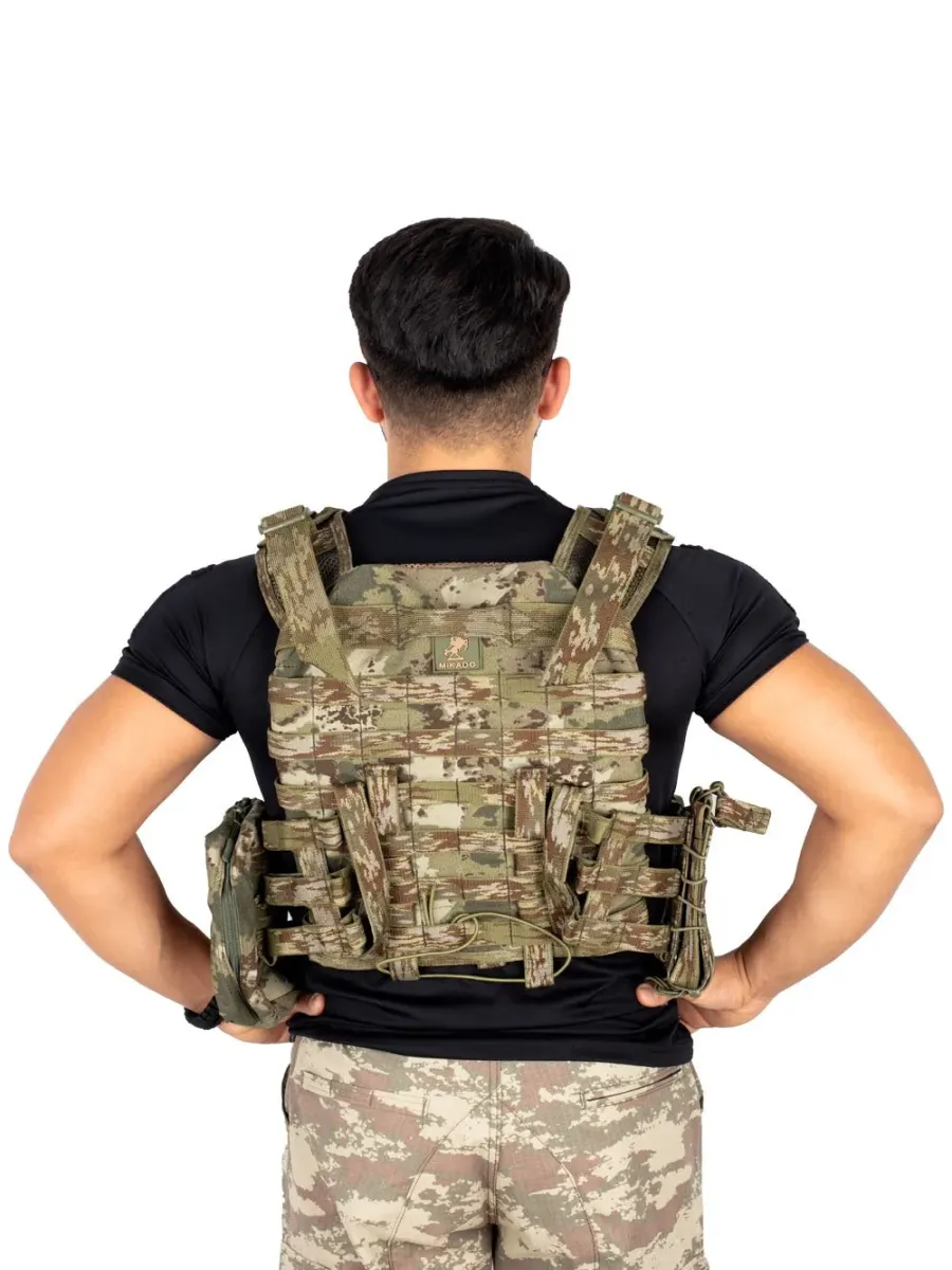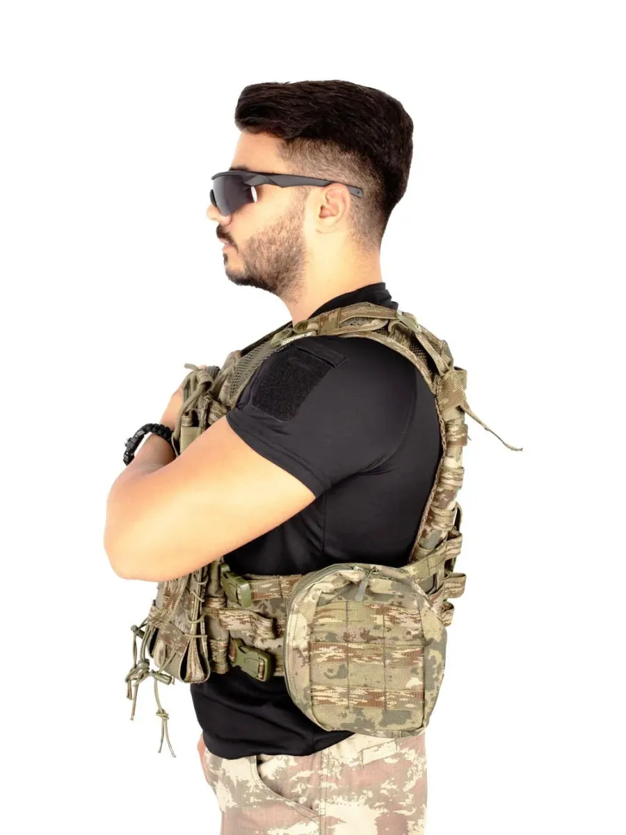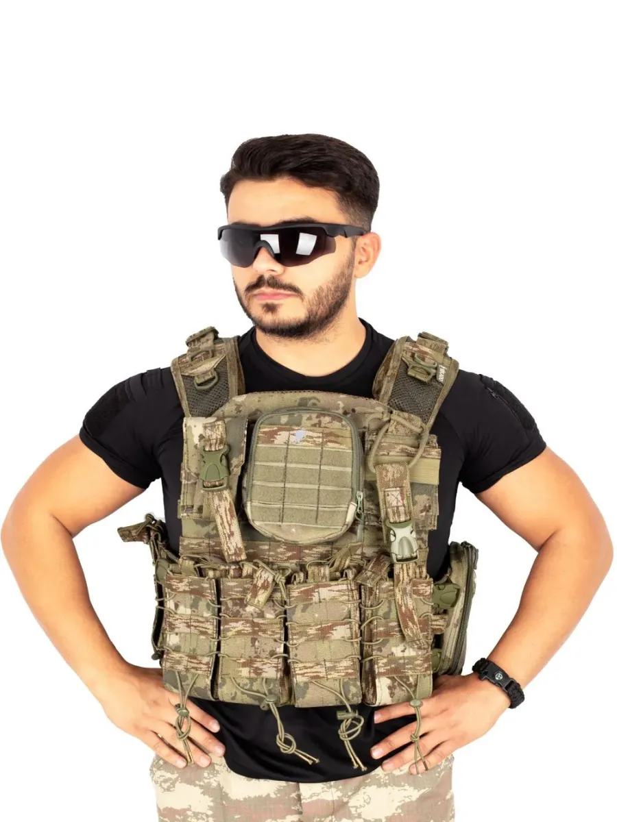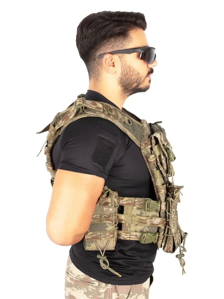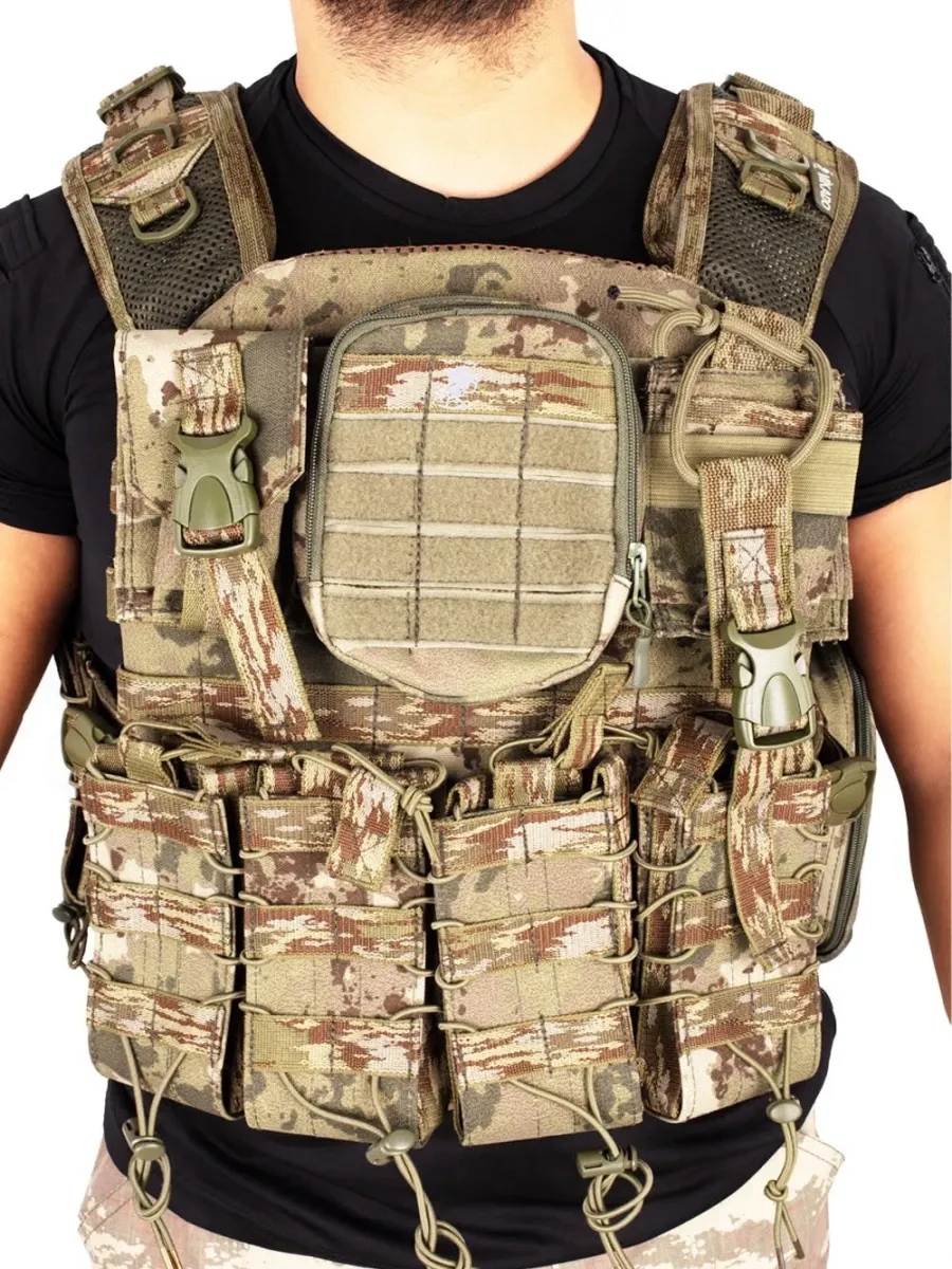 Dayanıklı cordura kumaştan haki kamuflaj tam donanımlı hücum yeleği, ayarlanabilir omuz ve genişlik sistemiyle her bedene uyum sağlar.