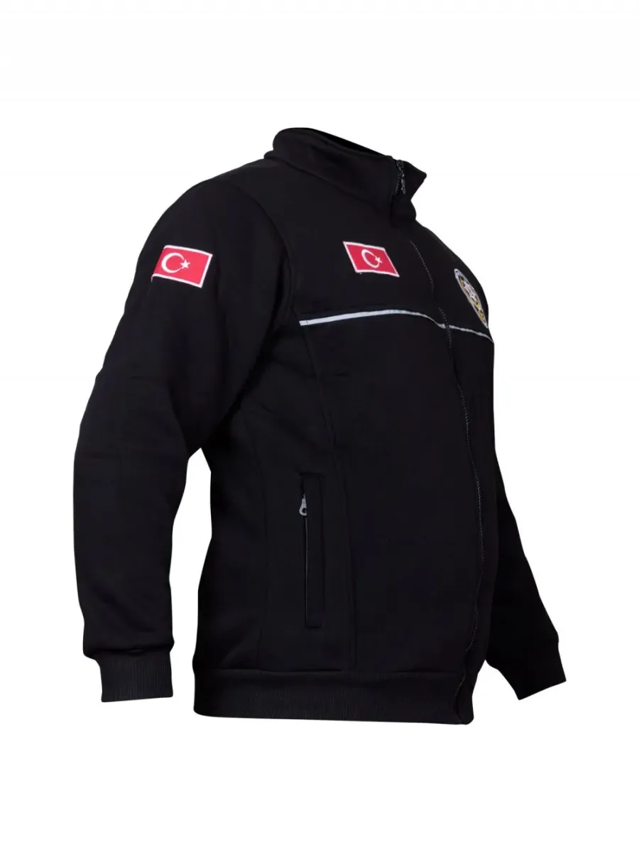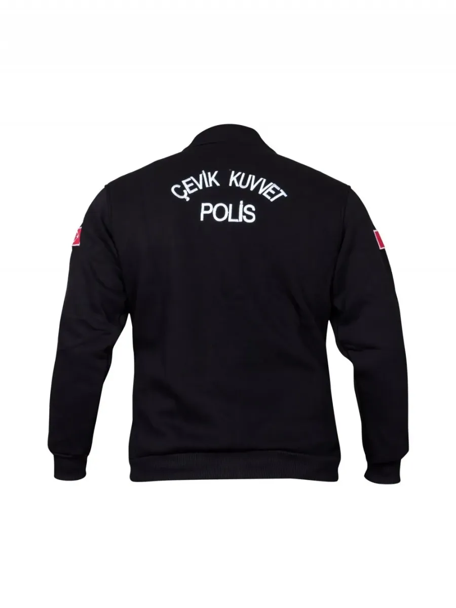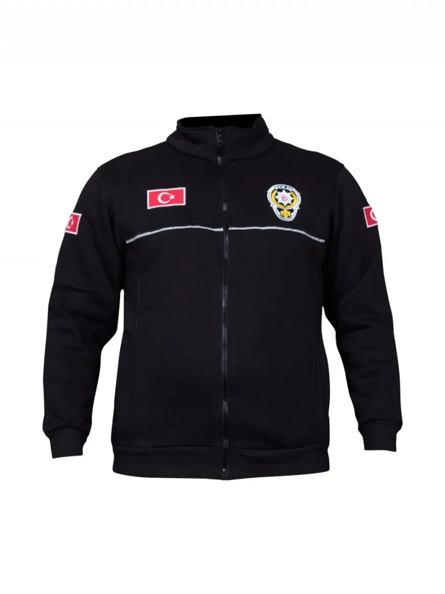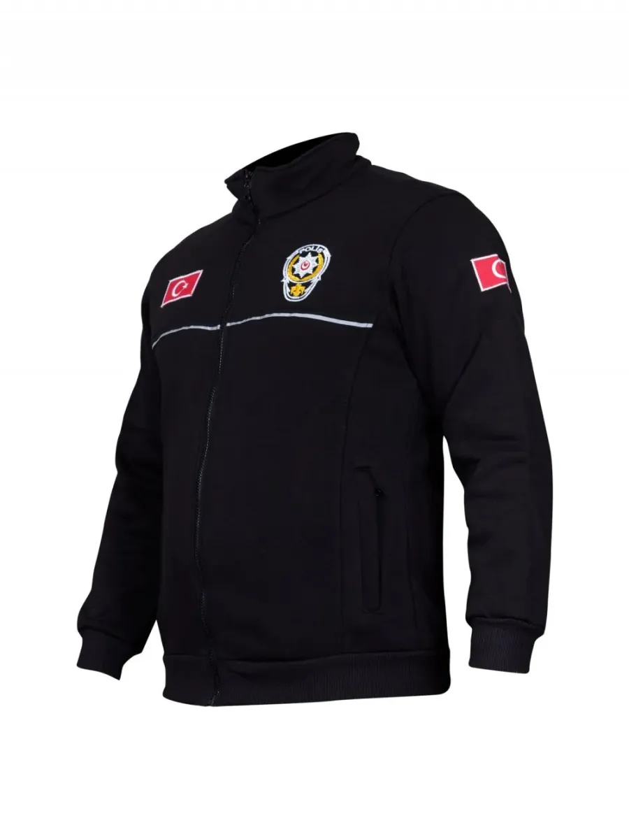 Türk Bayraklı üç iplik çevik polis polar, kaliteli malzeme ve şık slim kesimiyle konforlu kullanım sunar. Dayanıklı, siyah hakim yakalı mont tasarımı.